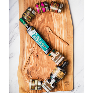 Ces planches en bois d'olivier durables sont fabriquées à la main au Canada à partir de branches d'olivier tombées ou taillées à Reggio de Calabre, en Italie, sur le domaine Olearia San Giorgio. La Calabre, qui signifie terre fertile, est l'endroit où continuent de pousser les plus grands oliviers du monde. Le bois d'olivier est particulièrement dense et robuste avec une haute résistance à l'abrasion, ce qui en fait un bois beau et durable. Cette œuvre d’art est réalisée à partir d’une pièce sans couture qui pourrait avoir jusqu’à 400 ans.